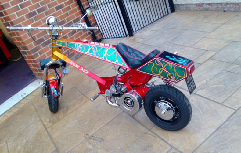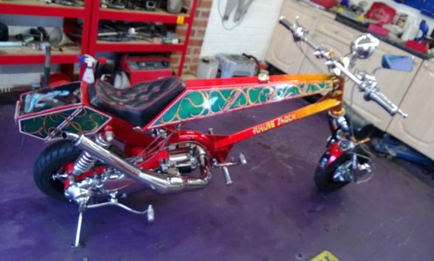 Saying all that, once in a while a chopper comes along that is just SO good that you can’t ignore it. It imbeds itself in your brain, and comes to define the category. Future Shock is the machine that does this… a completely radical, stunningly executed concept that has become, well, iconic. With numerous appearances in the scootering press over the years, you can’t help having noticed it, and admired the vision, time and artistry that has gone into it. Now you can own it. It’s on eBay now, sitting (at time of typing at a tad over £4k). Here’s the eBay link.