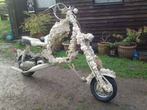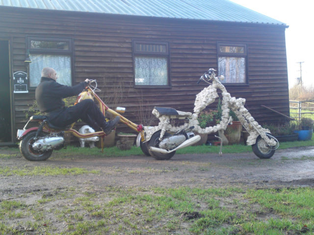 Skullduggery + Egyptian SwanCards on the table… I’ve said it before, and I’ll probably say it again. I’m not really into choppers. So I’ve ummed and ahhed about putting these two scoots in. They’ve been on eBay for a while, and the owner isn’t really bothered about selling them, unless he gets the right price. (£10k each) When you read the story that goes with them, you’ll understand why, and understand why I’ve written this post. Because, although I may not be into chops, I am into Lambrettas, a good story, passion, commitment and vision. And that is what it took Nipper to build ’em.Skullduggery2-1Skullduggery-2