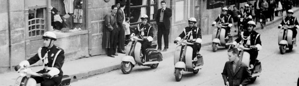 The final picture is later, and features the Scooterlinea (or Slimstyle) Series 3 Serveta. They don’t appear to have front dampers, or disc brakes, and the front one seems to have a “Special” badge, rather than a “Jet” one. The obvious addition is that large flyscreen, this tiime with a (presumably) blue light built in.