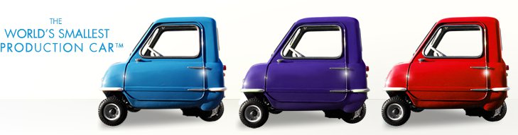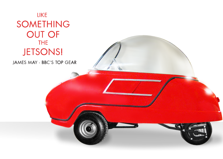 I’ve always loved these little British bubble cars. The 50cc Peel P50 (above), famously driven around the BBC offices at White City by Jeremy Clarkson (and John Humphrys) for Top Gear took the microcar concept to it’s logical conclusion, and gained a Guinness World Record for being the smallest car in the world. Well, you may have heard that the Peel is back. Available in an original 50cc moped engined version, and now a 1.5Kw electric version, it’s made appearances on Dragons Den and Cadbury’s Adverts.