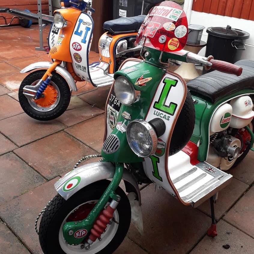 I see a lot of nice Lambrettas out there on the internet – many of them customised to the owners personal taste. In some cases, I can admire the work that’s gone into a scoot, but it’s “just not my thing”. On the other hand, sometimes I see one (or in this case two) that really float my boat. I came across this pair on a Facebook group, and thought, yeah, they’ll do! Everything about them is spot on, both of them, although they’re sublty different (rear footboard, a bit more chrome, fork embellishers on the orange one) they work nicely as a pair – and everything about them just seems ‘right’. Love the stickered-up aesthetic (but it’s got to be the right stickers)!