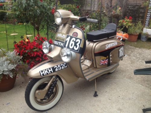 The second has taken the Golden Special, and added gold. Gold plated engine parts and brightwork. It looks very classy next to that well preserved ’80’s Vespa (a Cosa? I’m no expert!) If it floats your boat, check it out on eBay
