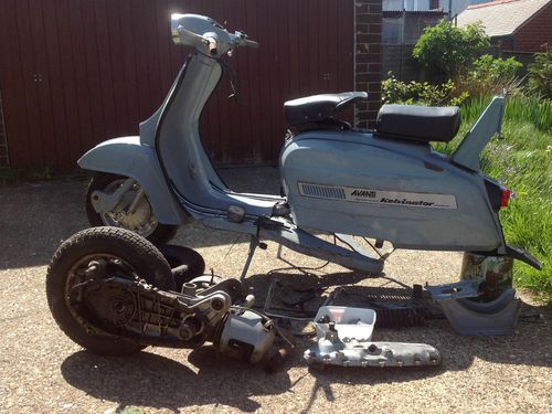 If you fancy something a bit prettier, and more, er, Italian, for about the same money (£100 cheaper actually!) There’s this J50 Delux. It’s got 50 less cc’s but it is in what’s probably my favourite Lambretta colour, Mela Verde (or Apple Green). You’ll need to be a bit handy with the spanners, because although it seems to be complete, it’s in bits.