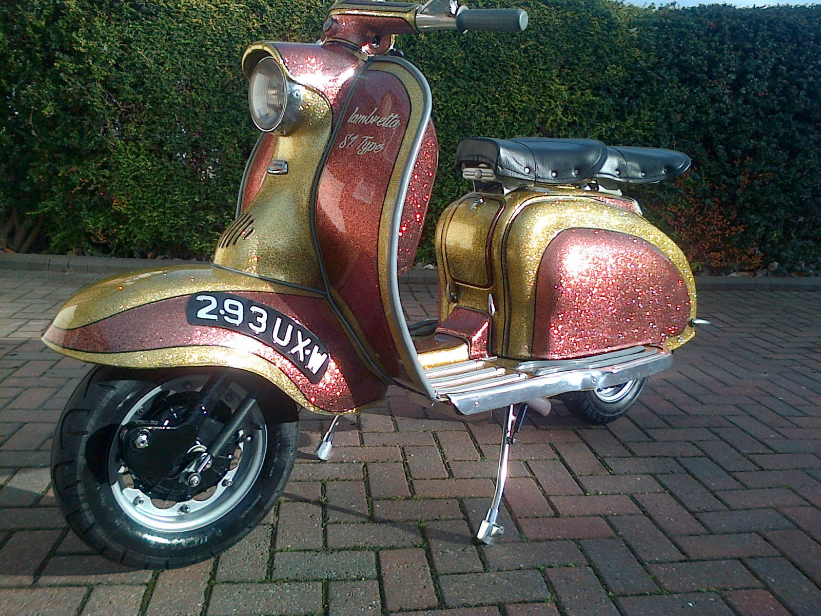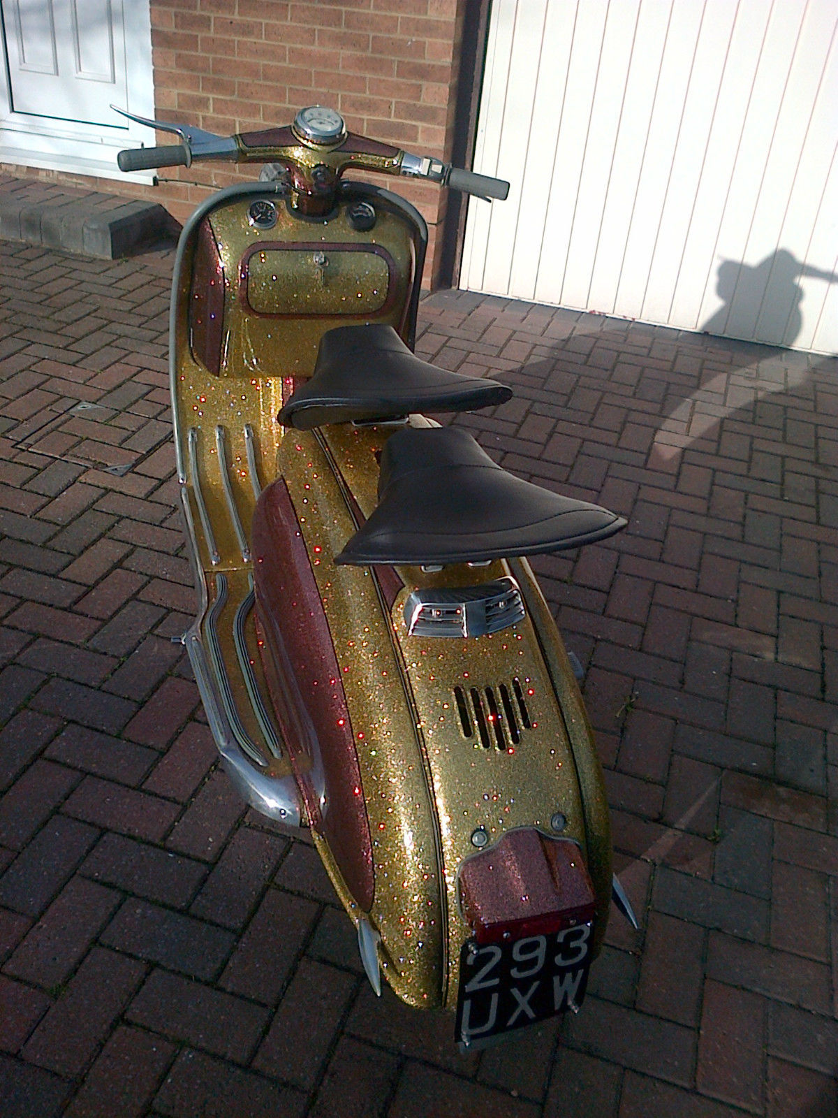 MetalFlakey that is. I think this is what you’d call a ‘real bobby dazzler’ gold and copper metalflake on S1 Framebreather. Spotted this on beauty on eBay… it’s in just finished condition and got a Stage 4, 200cc engine in, so the performance won’t be a let down. I know this is a late 50’s scoot… but for me, it’s got a bit of a 70’s vibe about it. In a good way. If Brian Connolly rode a Lammy, it would look like this. A Sweet ride.