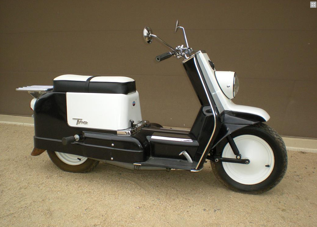 The Topper was the only scooter Harley Davidson every produced. Made between 1961 and 1965, and despite it’s squarish, “50’s American Refrigerator” lines, it’s certainly not a bad looking scooter. (That last sentence just shows how much my aesthetics have changed over the years… I remember when I first saw a picture of a Topper I thought it unbelievably fugly!). Let’s just say it’s “of its time”.