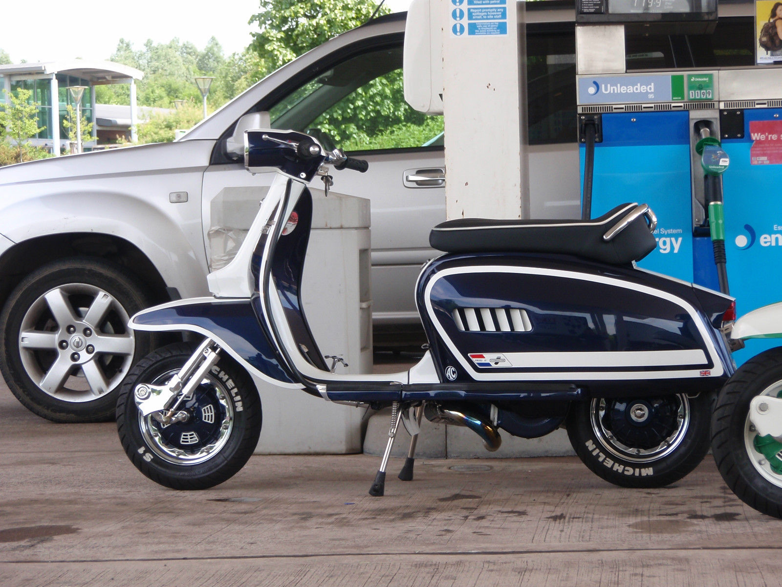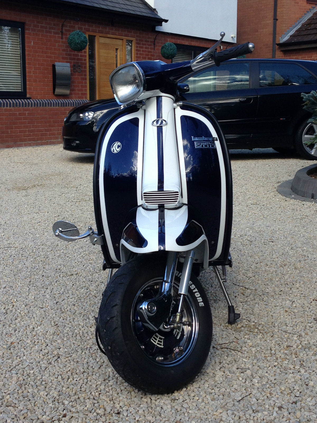 An original Italian GP 200 with matching frame numbers, the current owner reckon stop have spent over £25k getting the scooter to look this good. One of the ‘signature pieces’ is the (genuine Taffspeed) exhaust, modified to replicate that of the AC Cobra, which , along with the vented side panels make this scoot truly unique.