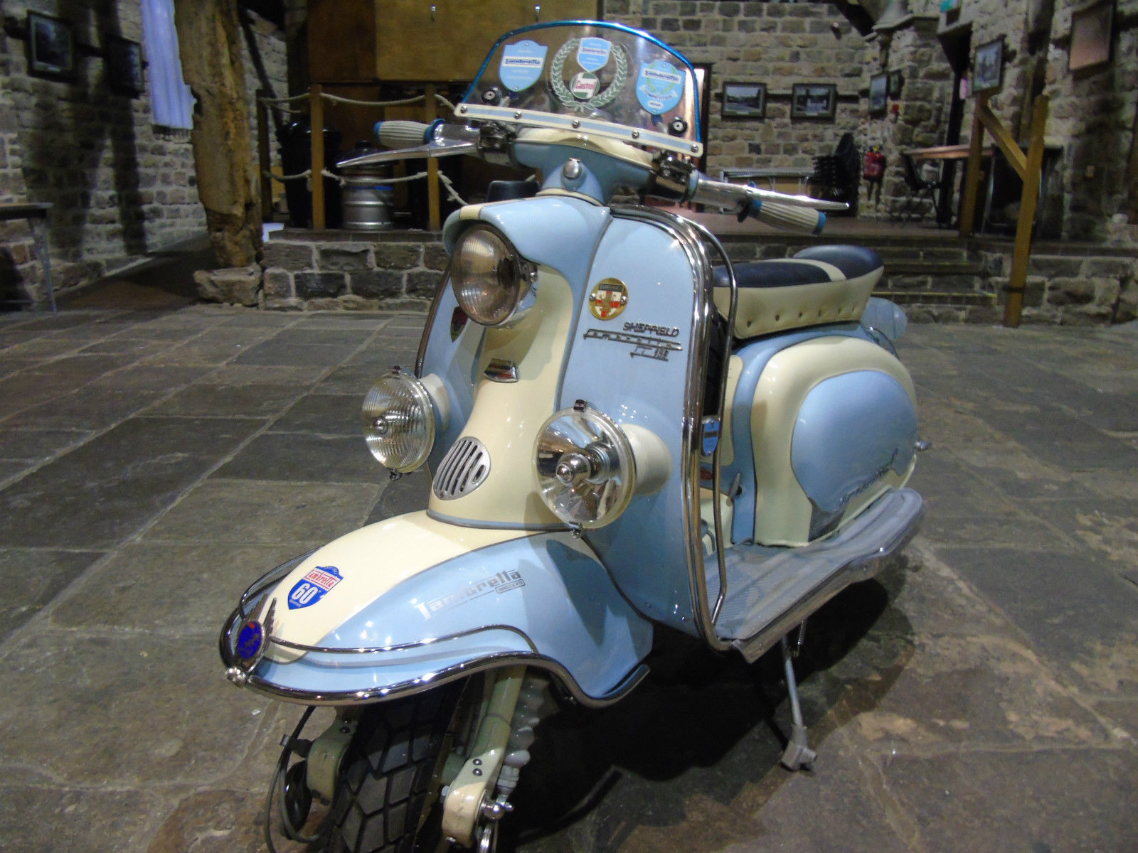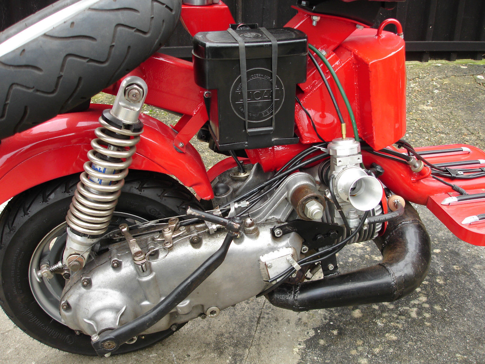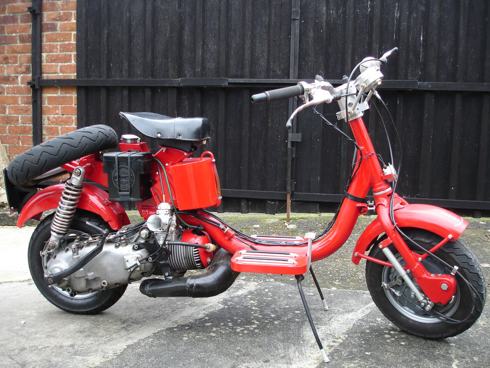 A few of the features are; a £2800 paint job, legshield mounted tool-box, locking panels, Delorto 28mm carb, polished engine casing, stainless steel cylinder and fan cowlings, stainless medium-range fuel tank, custom fuel and choke lever heads, polished aluminium SIP tubeless wheels, scootRS front outboard hydraulic disc brake with Nissin caliper, Kawasaki front dampers, PM Tuning fully adjustable remote-canister rear shocker. The scooter comes with matching genuine Arai helmet – size S ( 55-56cm ), and a set of three custom-made rear sprint racks.