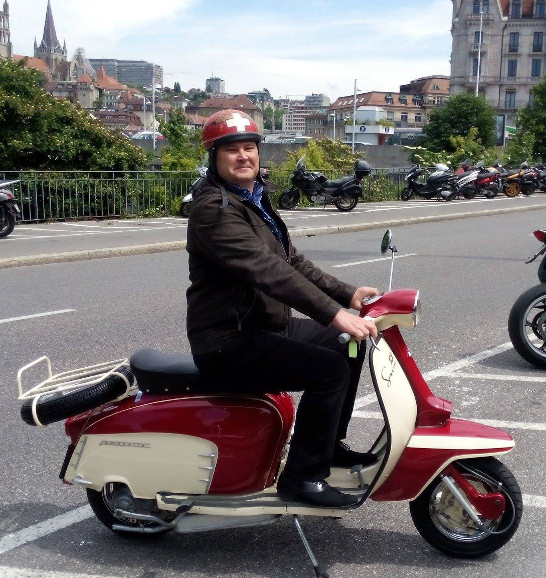 Didier, or to give him his full appellation “Lord Didier Coquoz” sent me this pic via the blog’s Facebook page. He’s astride his ’66 150 Special, and particularly proud of his original 1960’s helmet, hand painted by himself “when he was a kid, a couple of weeks ago!” You may spot that he is Swiss. That scooter (restored by lambrettista.ch) looks worthy of a few close ups!