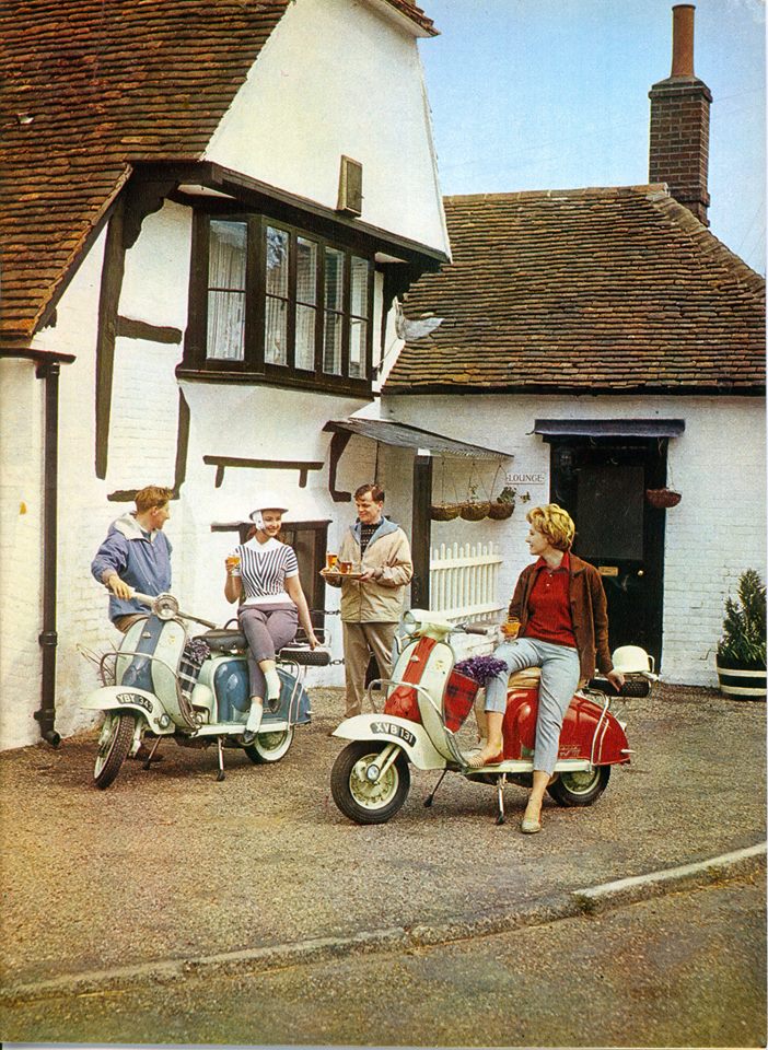 I’ve got a folder on my mac of pics I’ve collected over the years… I don’t know where most of them came from, but each of them must have a story behind them. I’ve done a Google image search on this one, with no joy – so if you’ve got any idea who this lot are please let me know! They’re clearly a mixed bunch of machines here, so not a Lambretta club – if they’re a club at all, and not just a random meet up! I’m guessing early 60’s from the S2 Lambrettas – (Vespa experts will know when that GS ‘came out’) though pre-mod or just ‘not mod’ with just ‘sensible’ accessories and proper riding gear! Number plate experts might be able to pin it down from the MN suffix… Isle of Man? Manchester? Does the structure in the background give any clues… is it a bus/coach station?